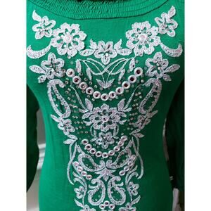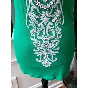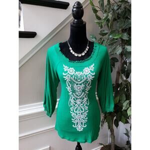 This beautiful women’s INC top features intricate white floral embroidery on a vibrant green rayon fabric. Designed with a flattering scoop neckline, stylish 3/4 sleeves, and soft stretchy material for comfort. Perfect for casual or boho-chic looks, this tunic-style blouse pairs well with jeans or skirts. Gently used and in excellent condition.
