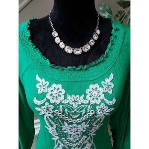Women's INC Green Embroidered Top Medium 3 4 Sleeve Boho Floral Tunic