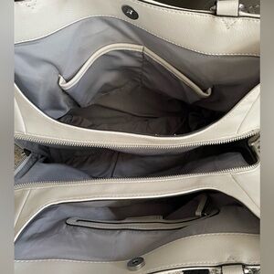 The essential office tote gets a glam update with this Tripping chain tote. 16W x12”H x 6”D. Magnetic snap closure. Silver tone hardware and back slip pocket. Two interior slip pockets and zip pocket. Tablet compatible.