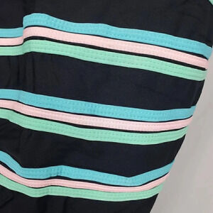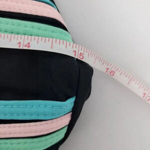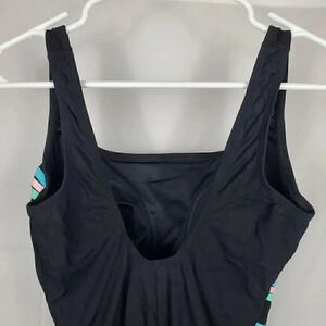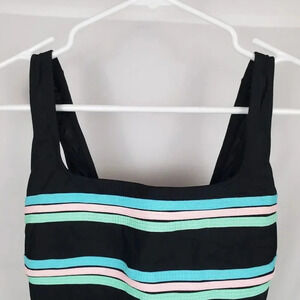 Get ready to hit the beach or pool in style with this stunning black one piece vintage swimsuit from Inches Away, size 10. Designed with a wide strap and built-in bra, this swimsuit will leave you feeling comfortable all day long. The slimming and tummy control features will flatter your figure, while the lightweight and stretch material will provide you with a comfortable fit. The swimsuit features stunning pastel applique stripes and is made from a combination of 85% nylon/15% lycra spandex. You're sure to find the perfect swimsuit for your next adventure. So why wait? Add this one piece swimsuit to your collection today and make a statement at the beach! Suit features a square neckline and deep scoop back. Measurements are approximately 5.5" to the neckline, 25.5" in length, 11" to the back scoop, and 15" from pit to pit.