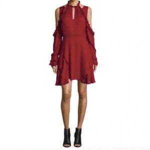 This IRO Women's Burgundy Red Cocktail Dress is a stylish and elegant option for formal occasions like weddings or parties. The dress features a solid red color with slit sleeves and ruffle accents, giving it a unique and fashionable look. The fit and flare style, round neckline, and zip closure add to the dress's chic design. Perfect for the winter, fall, or spring seasons, this short dress is a designer piece that exudes a classic and sophisticated vibe, making it a standout choice for those who appreciate high-end fashion. Size 2