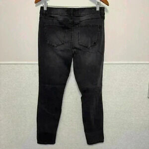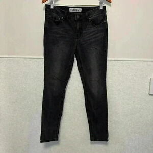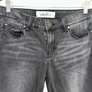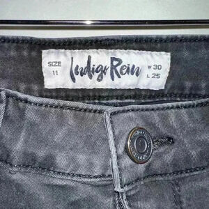 These are a pair of pre-owned Indigo Rein women's jeans in a dark gray wash. They are size 11, with a waist of 30 and a length of 25. The jeans have a slim fit and are made of a soft, stretchy denim. They feature a button fly closure, five pockets, and a belt loop waistband. The jeans are in good condition with minimal signs of wear. There is a small hole on the back right pocket. The jeans are approximately 38 inches in length and 16 inches across the waist.