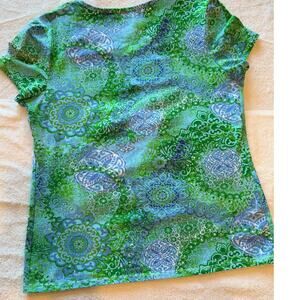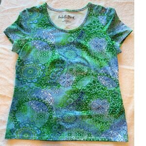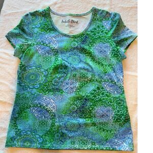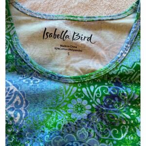 Women’s Isabella Bird Tee Shirt. Size S. Colored with variations of green, purple, and blues. It’s a basic shirt that can be dressed up or down because of the beautiful color way. Like new condition with no rips, pilling, or stains.