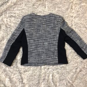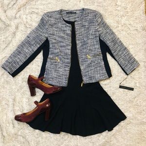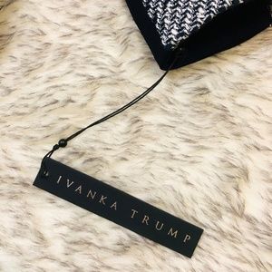 This sophisticated and versatile Ivanka Trump blazer is brand new with tags. It features extravagant gold zippers down the front and along the 2 side pockets that are sure to catch the eyes and attention of all those around you. There are dark navy blue (almost black) solid side panels encompassing each side to enhance the hourglass figure as well as the inner sleeves. It is partially lined on the inner side. Sleeves are a classy 3/4 length.