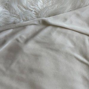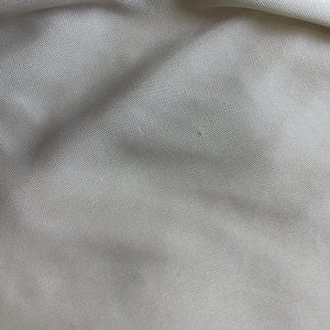 Tag was cut out, I am fairly certain this is a polyester blend fabric and probably a Large or Medium. Please see measurement pics. The fabric drapes but also has a bit of stretch/ elasticity. The fabric has very minor pilling. Looks very cute on. Adjustable sizing due to fabric elasticity draping and behind neck tie.