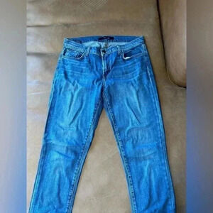 These women's J Brand jeans are a stylish addition to any wardrobe. The solid pattern and blue color make them perfect for any season, and the button and zipper closures ensure a secure fit. The jeans are made with medium fabric wash and have an inseam of 28.5 inches. They are a regular size and have a skinny style. Perfect for the fashion-conscious woman on the go, these jeans are sure to impress.