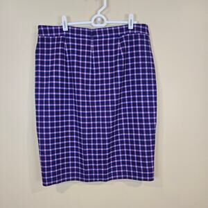 Excellent condition, women's J. Crew blue and red plaid, button front, lined pencil skirt. This skirt hits right below the knee. This has a back zipper and doesn't stretch.