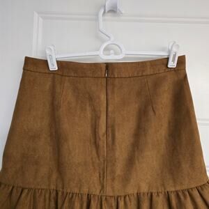 Women's J. Crew brown, suede mini skirt that has a bottom ruffle. This skirt is lined and has a back zipper closure. This material doesn't stretch. This is dry clean only - there is a TINY spot on the front, may come clean with dry cleaning (not attempted).