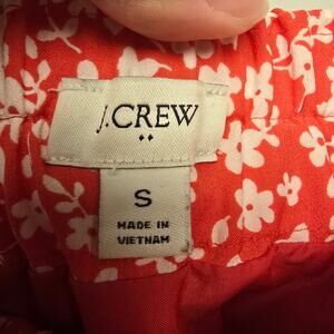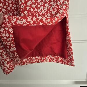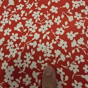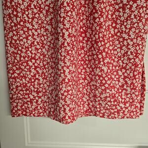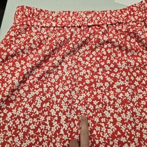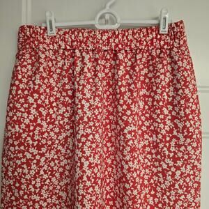 Excellent condition, women's J. Crew red (with a coral hue) and white floral, midi skirt with an elastic waist. This skirt has a side slit and is lined. The waist stretches, the skirt material doesn't. There is a TINY spot on the front (see last picture).