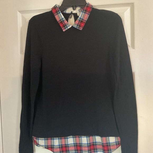 Women’s J Crew Size Small Black Sweater with Snowy Tartan Collar and Hem Detail