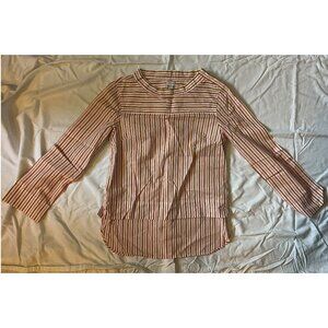 Pink, brown, and white striped blouse from J. Crew Factory featuring a funnel neck, button detail along the left shoulder, and a shirttail hem on the back. Pre-owned, but never worn. The top is in excellent condition.