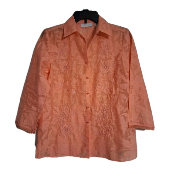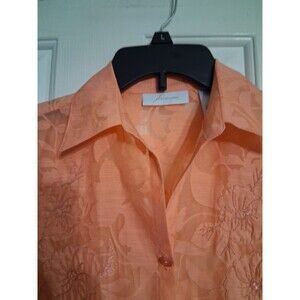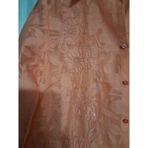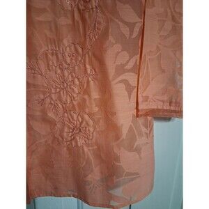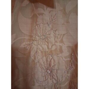 Women's JH Collectibles 3/4 sleeve peach Sheer beaded top size small. Polyester and cotton Blend. Embroidered flowers with beads. Side slits. Please see last Pic. This is the only flaw I see. Otherwise good preowned condition.