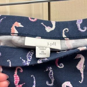 Easy comfortable pull-on skirt with pockets elastic waistband. The print is cute seahorses. Background is navy and pattern incorporates a coral, bright pink, dark blue, and two shades of lavender. In excellent condition.