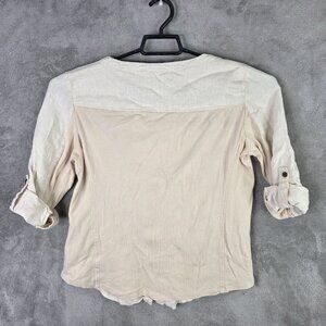 Womens JM Collection Beige Linen Blend Shirt Button Up Roll Tab Sleeve V Neck 8