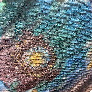This textured tunic top features a vibrant multicolor floral design and rhinestone accents for a stylish and polished look.