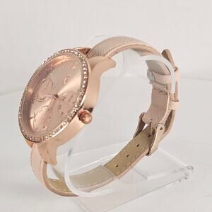 Stylish JS quartz analog women's wristwatch with a rose gold-tone dial and crystal-studded bezel. Features three subdials (decorative only), blush faux leather band, and Japanese movement. Case measures approx. 38.5mm wide with an 11.8mm band width.