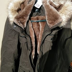 Army Green hooded jacket with zipper and buttons in front