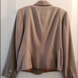Taupe double-breasted waist length light weight jacket.