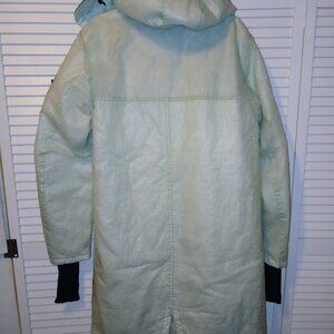 It's a woman's jacket that is a size Large. It looks like a mint green or a sort of blueish color. It would fit someone that's 5'8 to 5'10 long on them.