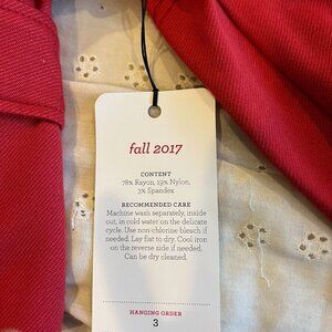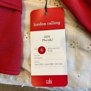 Cabi short red rayon blend mid weight jacket in size 6 is new with tags. This jacket has great detailing which includes two front lapel chest pockets, refined inside seaming, button cuffs and half button back belt. Jacket will be shipped from smoke free environment, orig. $159.
