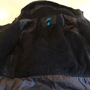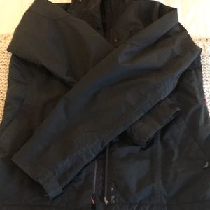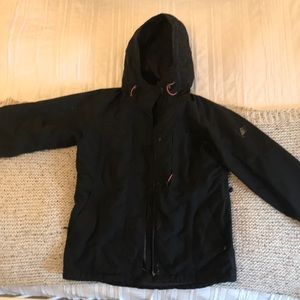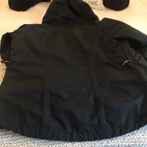 Black soft shell with liner in side winter coat. Jacket is X-Small with pink adjustable cord clips. Jackets has inner breast left side pocket as well as an outer pocket on upper right side. Jacket is slightly worn but still in Good condition. Must sell! Note coat looks very similar to first image but is not exact jacket *