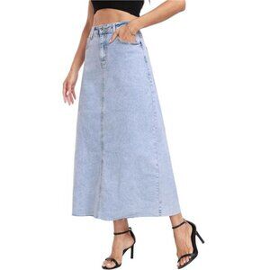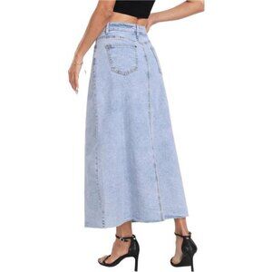 High waisted A-line silhouette with a button fly closure,functional front and back pockets for storing something. Raw hem detailing adds a modern touch. It has no lined, midi length balance modesty and trendiness