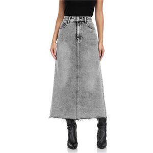 High waisted A-line silhouette with a button fly closure,functional front and back pockets for storing something. Raw hem detailing adds a modern touch. It has no lined, midi length balance modesty and trendiness