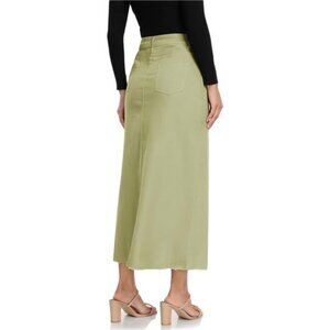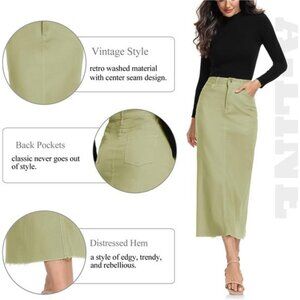 High waisted A-line silhouette with a button fly closure,functional front and back pockets for storing something. Raw hem detailing adds a modern touch. It has no lined, midi length balance modesty and trendiness