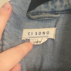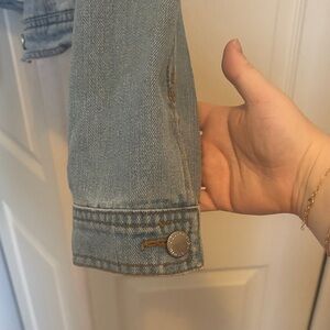 Light denim women’s jacket, silver buttons, fits perfectly and ends at the hips