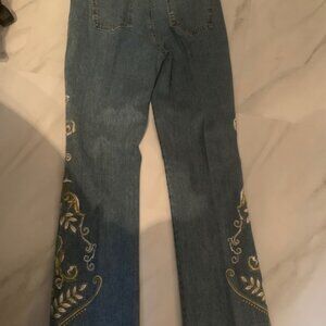 Shaded denim boot cut jeans with white and gold embroidery details! little hole inside of pocket lining, outstanding!