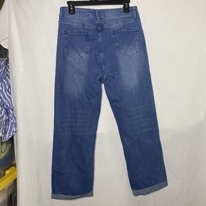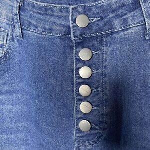 Relevant details: High rise fit with 6 button fly closure, 5 pocket design, distressed with fading and holes, cropped length, cuffed bottom hem