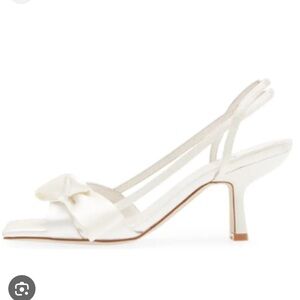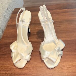 Women’s Jeffrey Campbell white take a bow sling back heels size 6.5 in ivory satin. Gently used pre-owned - worn once. Shoes have some minor scuffs and some light signs of wear on the sling back part but nothing major and nothing that affects the look or would be noticeable. No longer have the box. very cute! I tried to capture all the details and “flaws” as best as possible so you can see for yourself. Pictures were also taken with and without flash. Smoke free pet free home.