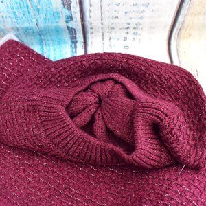 The set features a burgundy beanie hat and a 17" wide scarf,