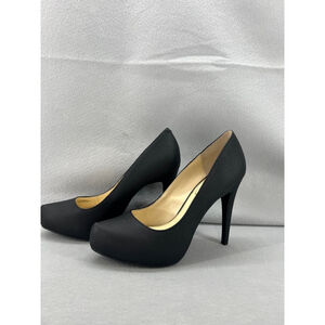 These are a pair of black, pre-owned, Jessica Simpson women's heels. They are made of a textured, faux leather material and have a pointed toe. The heels are approximately 4 inches tall and have a platform that is about 1 inch tall. The shoes have a closed toe and a slip-on design. The shoes are in good condition with some minor wear and tear on the soles. There are no visible rips or tears in the material. The shoes are a size 9.5 and are a great option for a night out or a special occasion.