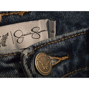 These are pre-owned Jessica Simpson 'Freesia' high-rise wide-leg jeans, size 6. The denim is a medium wash with visible fading throughout. They feature a standard five-pocket design and a button fly with a branded button. The hems are cuffed. There are no apparent tears or stains. The jeans appear to be in good, functional condition.