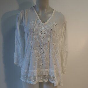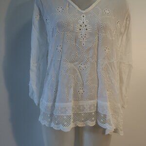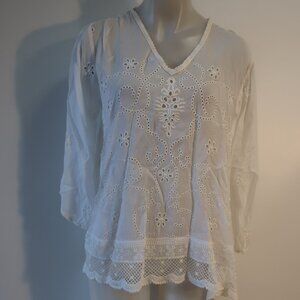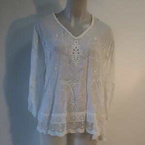 Womens Johnny Was White Eyelet V-Neck Blouse XS