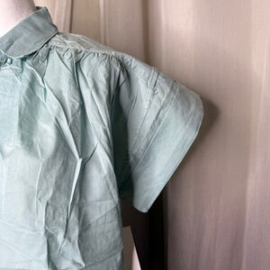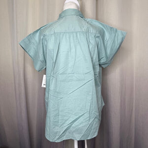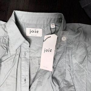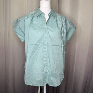 A pale teal, short-sleeved button-down shirt by Joie. The shirt is made of cotton and has a collared neckline. It is in new condition with tags.
