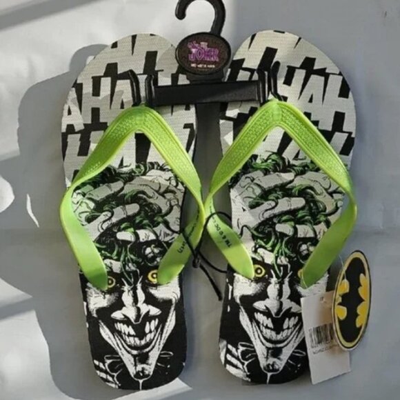 For true fans of the Batman universe, come these Bioworld flip-flops featuring Joker design. Black non-slip grip soles with vibrant green straps. Perfect for wearing poolside.