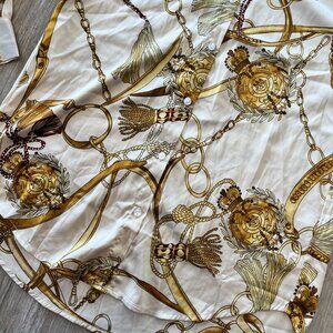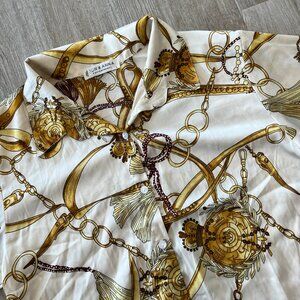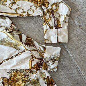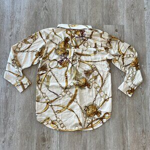 White and gold multicolored printed long sleeve button up top shirt blouse