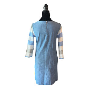 This is a pre-owned Joules dress featuring a striped pattern in white, blue, gray, and yellow. It has 3/4 sleeves, a round neckline, and two front pockets. The back is a solid light blue denim material with a zipper closure. The dress appears to be in good condition with no immediately visible imperfections. The material composition is unknown. A small metal Joules logo is on the bottom left.