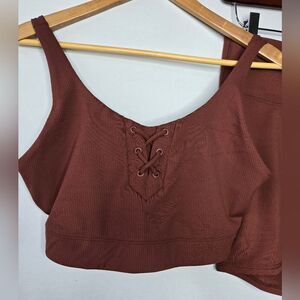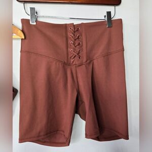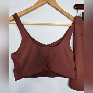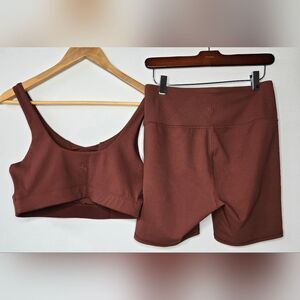Women's JoyLab milk chocolate brown workout sports bra top and bike shorts with cute lace-up and ribbed detail. The sports bra top is a size large and the bike shorts are a size medium.