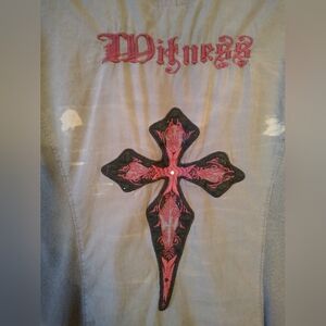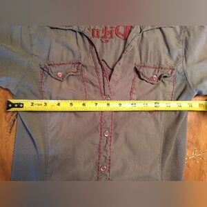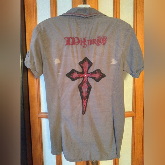 Very Cool Vintage 90s Y2K Snap Front Top, With Embroidered Cross Detail, Grey Red Black, Marks on it are part of the distressing. Slim fit, Sz M