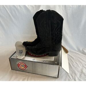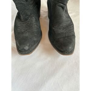 This is a pair of women's Justin boots in size 9 1/2 D. There is some wear to them on the toes, but they are still in good condition. They appear to be missing the original inserts to them and have another pair with them, although they are a different brand. Make sure to check out the pictures. They also come in a Justin box, but I am not sure it is the original box for this pair of boots. The top is leather and the bottom is manmade materials. These boots still have a lot of wear left in them. They are a soft, velvety leather on top.