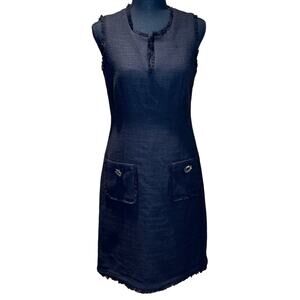 Style - Sleeveless, v-neck, shift dress. Zips in back. Two front pockets with gold/black buttons. Eyelash edging throughout. Fully lined.