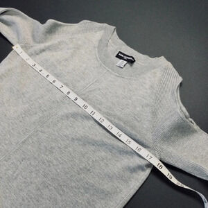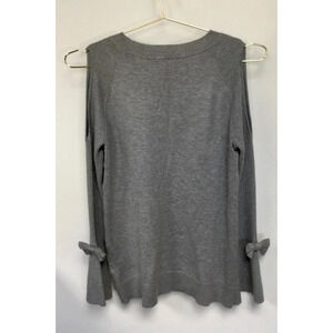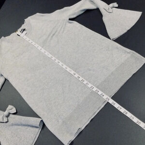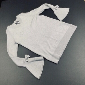 Pre-owned Karl Lagerfeld Paris gray sweater, size M. Made of 80% rayon and 20% nylon. Features cold shoulders, bell sleeves with bow details. Measures approximately 25 inches in length, 18 inches across the chest, and 27 inches in sleeve length. The sweater is in excellent condition with no visible imperfections.