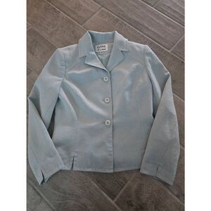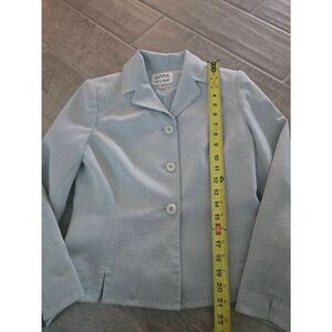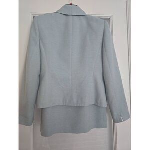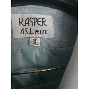 Women's Kasper A.S.L. Skirt Suit. Slightly textured knit material. Like a light Seafoam green/blue. 3 functional buttons. Zippered Skirt. Very good condition. Size 4 Petite, approximate measurements in photos.