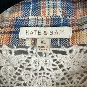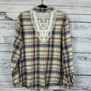 Women's Kate & Sam Cream Blue Crochet Lace Plaid Button Up Flannel Top Boho XL