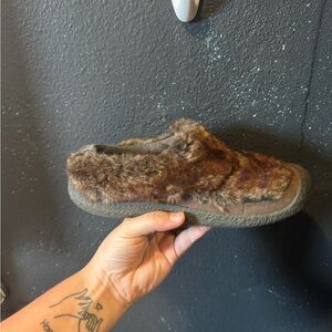 Keep your feet warm and stylish with these cozy brown shoes. Perfect for any casual outing. They are in great condition but one of them is missing the tightening strap.