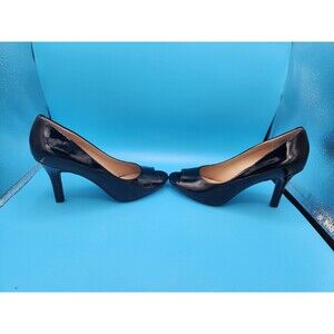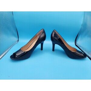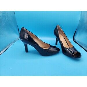 The women's Kelly & Katie IZZY open toe dress heels in size 8.5M are elegant and stylish shoes perfect for parties or formal occasions. These black pumps feature a solid pattern with a high stiletto heel measuring between 3-3.9 inches. The slip-on design and patent leather upper material add convenience and sophistication to the shoe, making it a versatile and fashionable choice for various events.