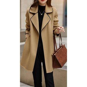 Women's Khaki Winter Elegant Lapel Open Front Wool Coat Wool Blend Trench Coat